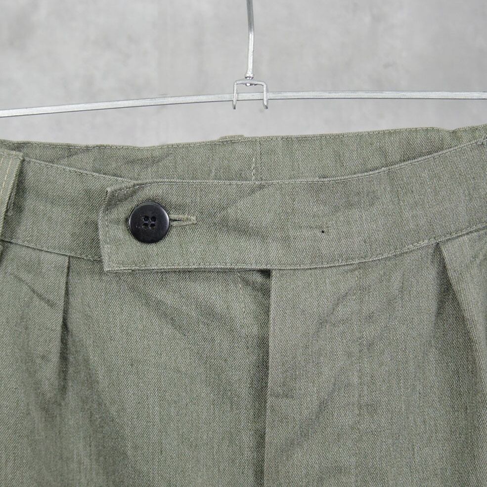 薄めのオリーブ色と太めのシルエットが特徴的な1着です。